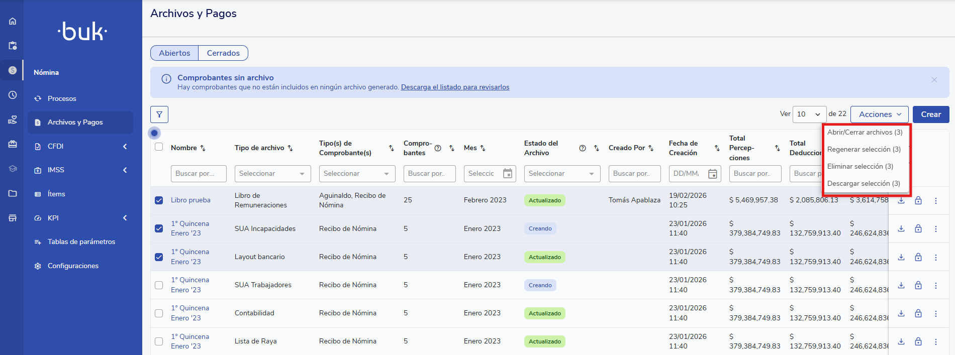 Podrás realizar acciones masivas sobre los archivos ya generados: