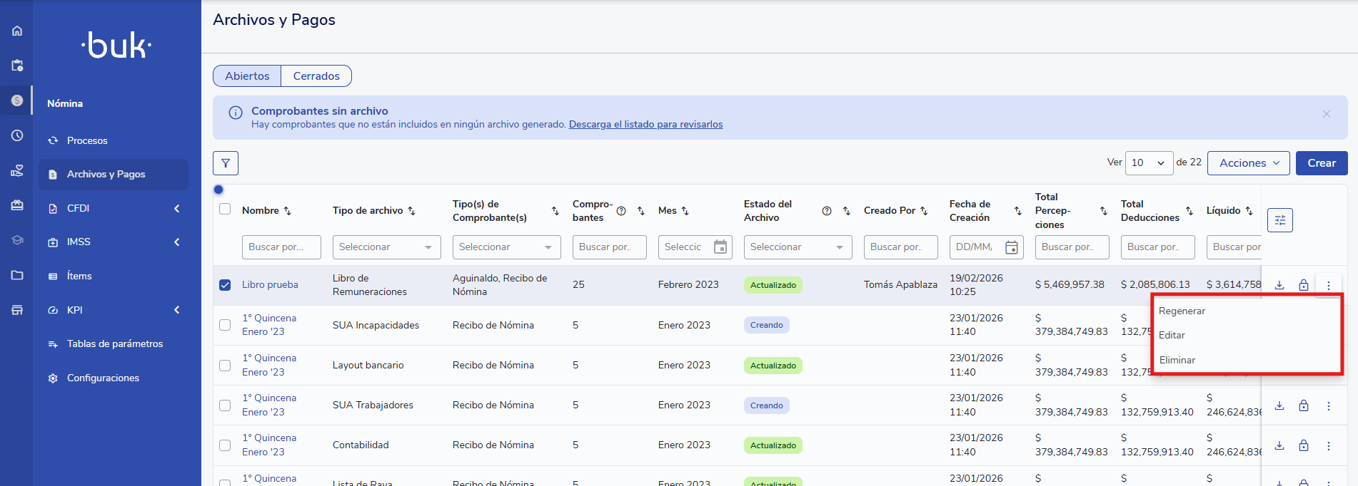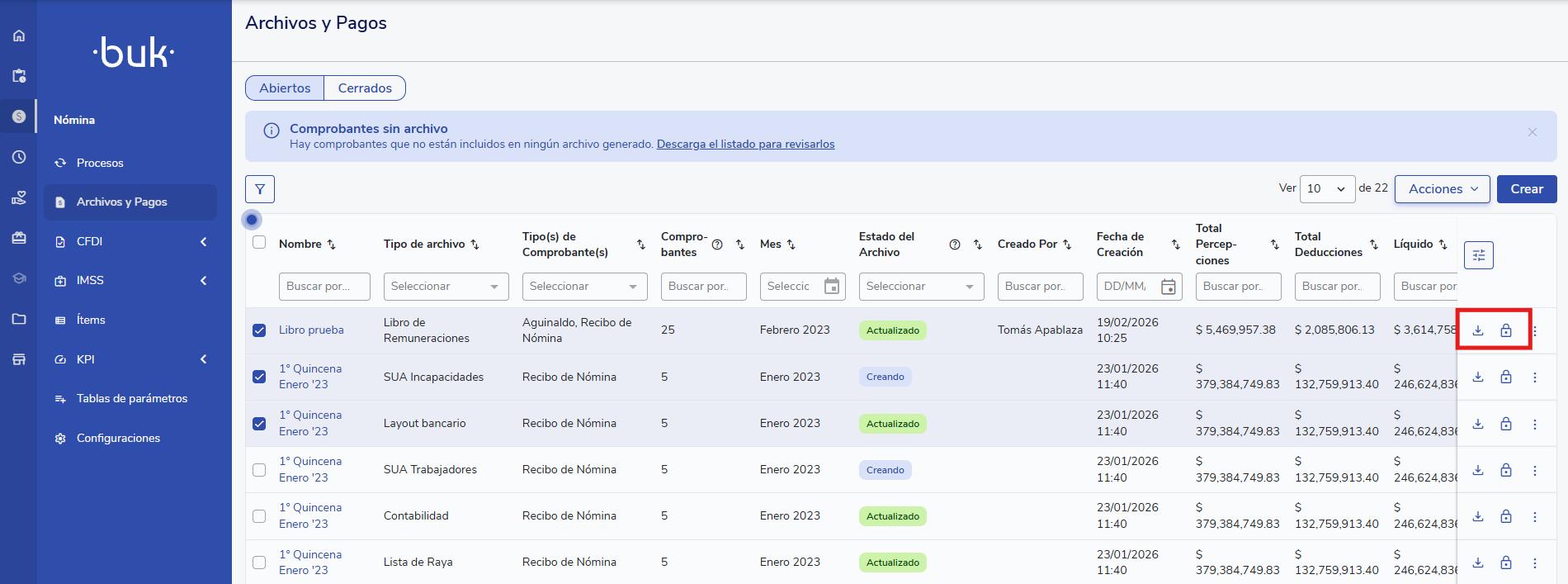 En Remuneración > Archivos y Pagos > Abiertos verás una tabla con las agrupaciones creadas. Cada fila incluye: