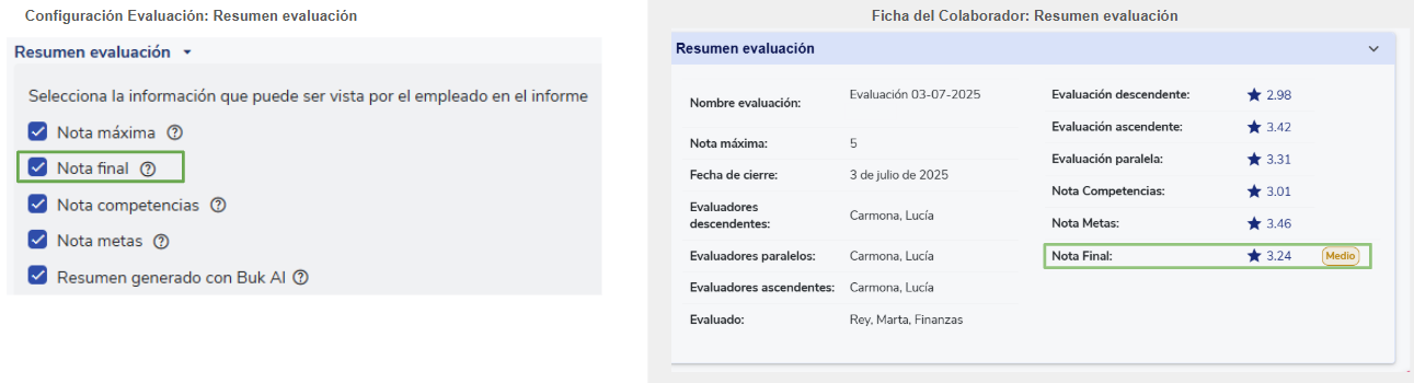 Importante: los cambios afectan únicamente lo que el colaborador ve en su ficha al revisar su evaluación. Si eres supervisor o administrador, seguirás viendo toda la información de la evaluación en la ficha del colaborador.