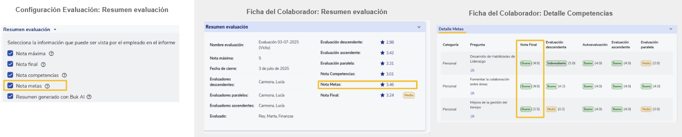 - Al deseleccionar el checkbox Nota objetivos/metas, se ocultará ese campo en la sección Resumen evaluación y también se ocultará la columna Nota Final dentro de la sección Detalle de objetivos/metas.