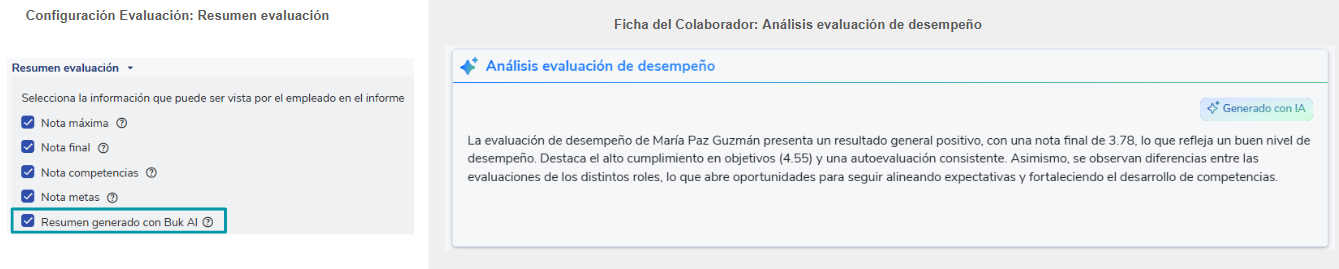 - Al deseleccionar el checkbox Resumen evaluación con Buk AI, se ocultará la sección de Análisis evaluación de desempeño el cual consiste en un resumen de la evaluación generado con inteligencia artificial.