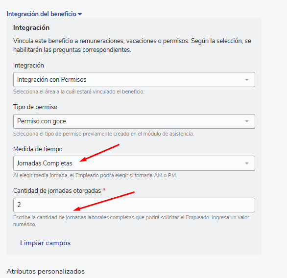La configuración y creación de un beneficio integrado con permisos, es igual al flujo habitual