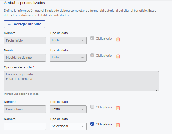 Una vez configurados todos los pasos anteriores encontrarás el apartado “Añadir Atributo” en el cual hay 3 campos bloqueados para edición que no podrán se modificados ya que son vitales para la solicitud por parte del colaborador: