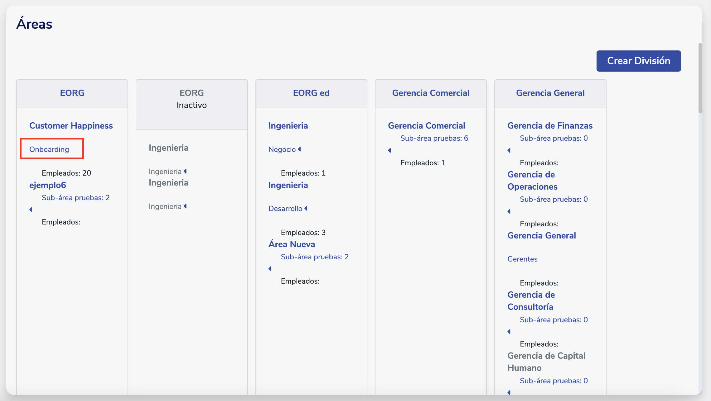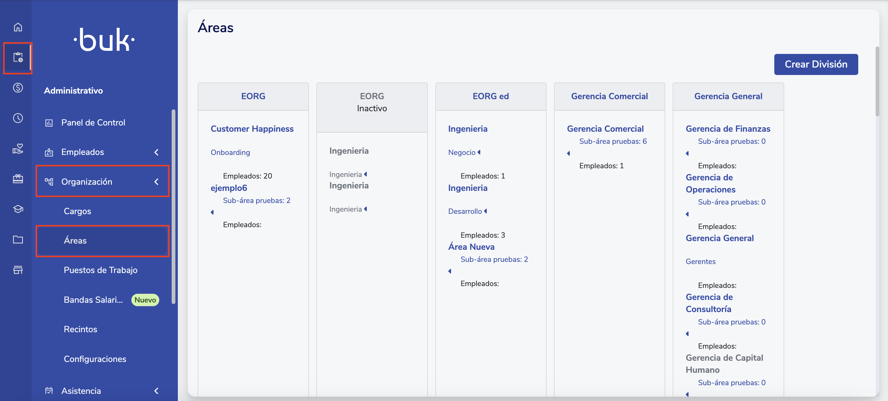 - Ve a Menú > Administrativo > Organización > Áreas.