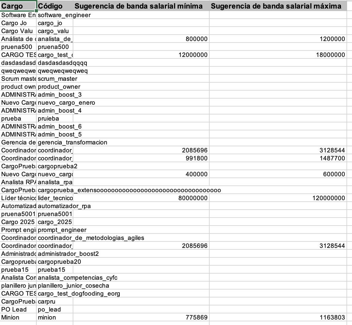 Debes copiar desde aquí los códigos de los cargos a los que deseas asignar bandas salariales, y pegarlos en la columna "Código de cargo" de la Hoja 1.