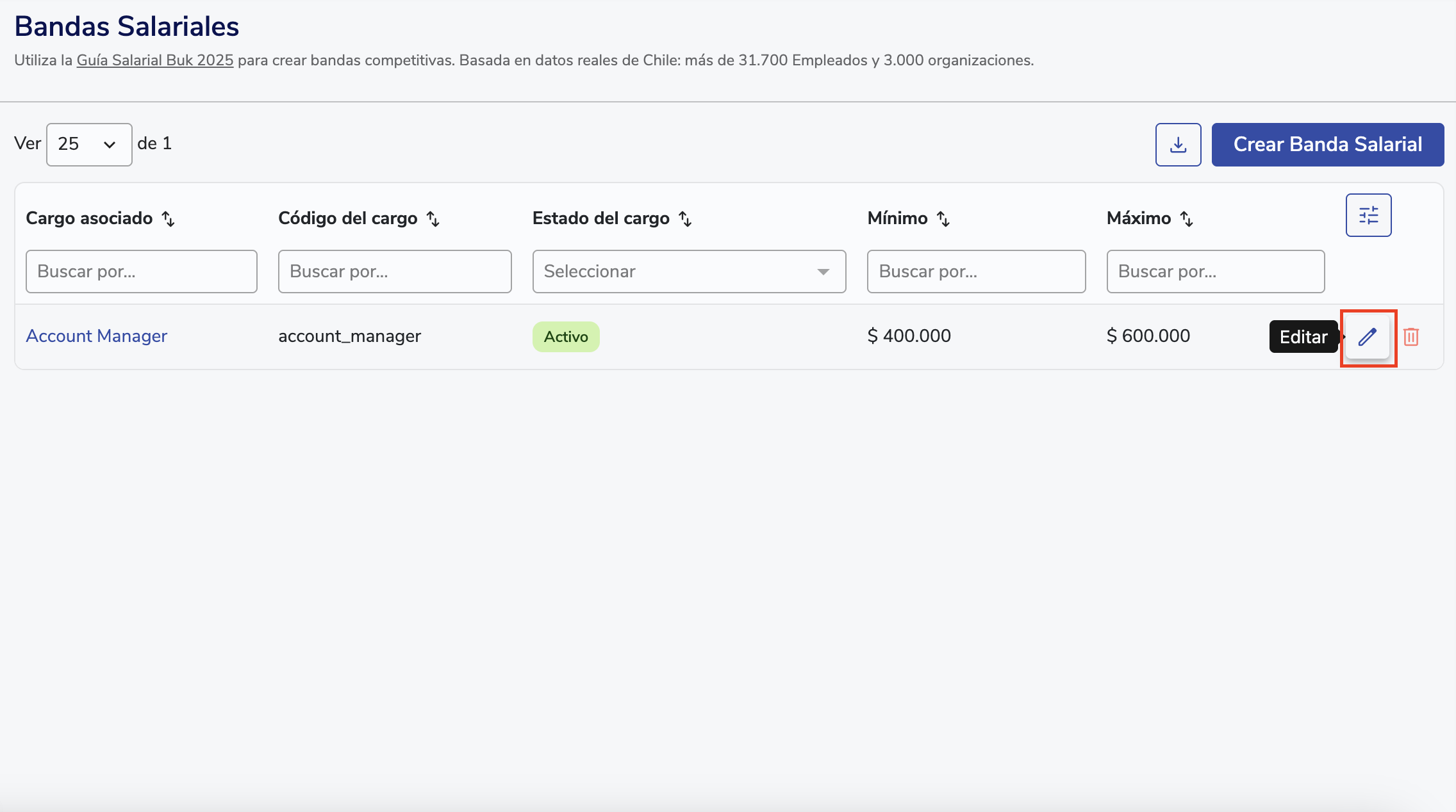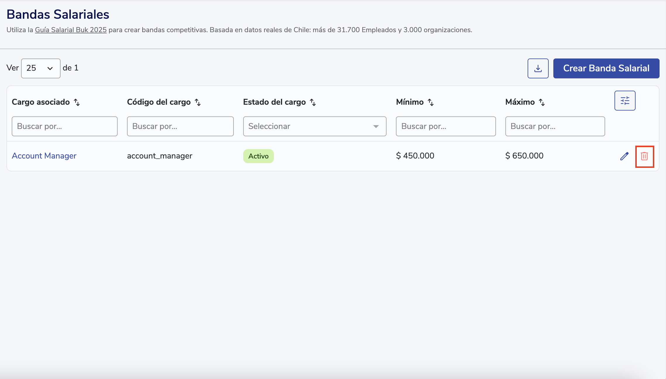Al presionar “Guardar” tu banda salarial quedará guardada y visible en la tabla. En esta tabla podrás buscar por cargo, filtrar por el estado del cargo al que está asociada la banda y buscar por mínimo o máximo.