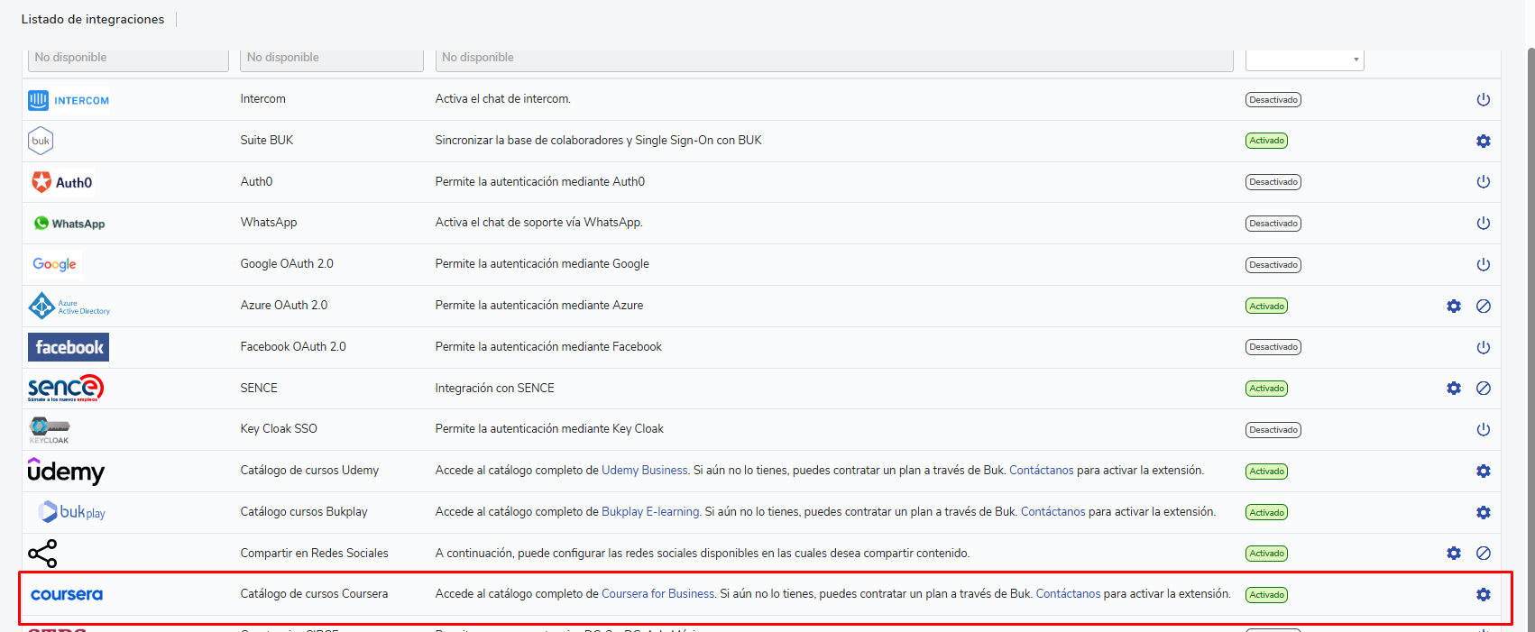 🔐 Importante: Para habilitar esta integración debes contar con una licencia activa de Coursera, contratada directamente con Buk o previamente gestionada desde Coursera. En este artículo se describen los pasos a seguir si contrataste la licencia con Buk.