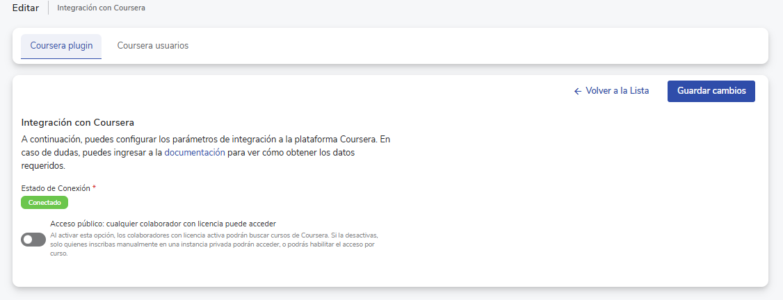 De tener la integración activa, desde esta sección puedes configurar que todos los cursos de este proveedor cuenten con instancias públicas, revisar a los usuarios vinculados con Coursera y sincronizar la información de colaboradores y sus avances.
