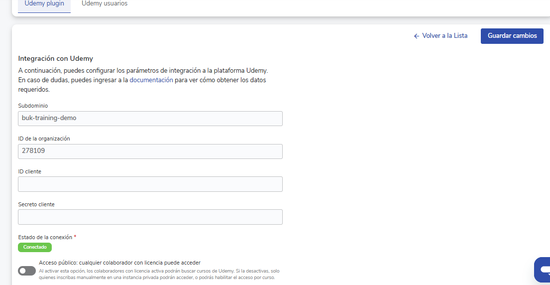 De tener la integración activa, desde esta sección puedes configurar que todos los cursos de este proveedor cuenten con acceso público, revisar a los usuarios vinculados con Udemy y sincronizar la información de colaboradores y sus avances.