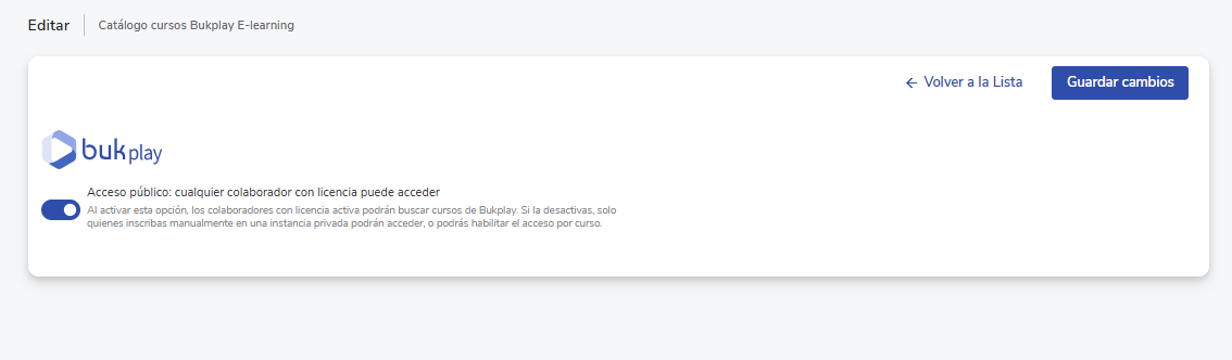 Al entrar a editar esta integración, se muestra la opción de activar acceso público para todos los cursos Bukplay.