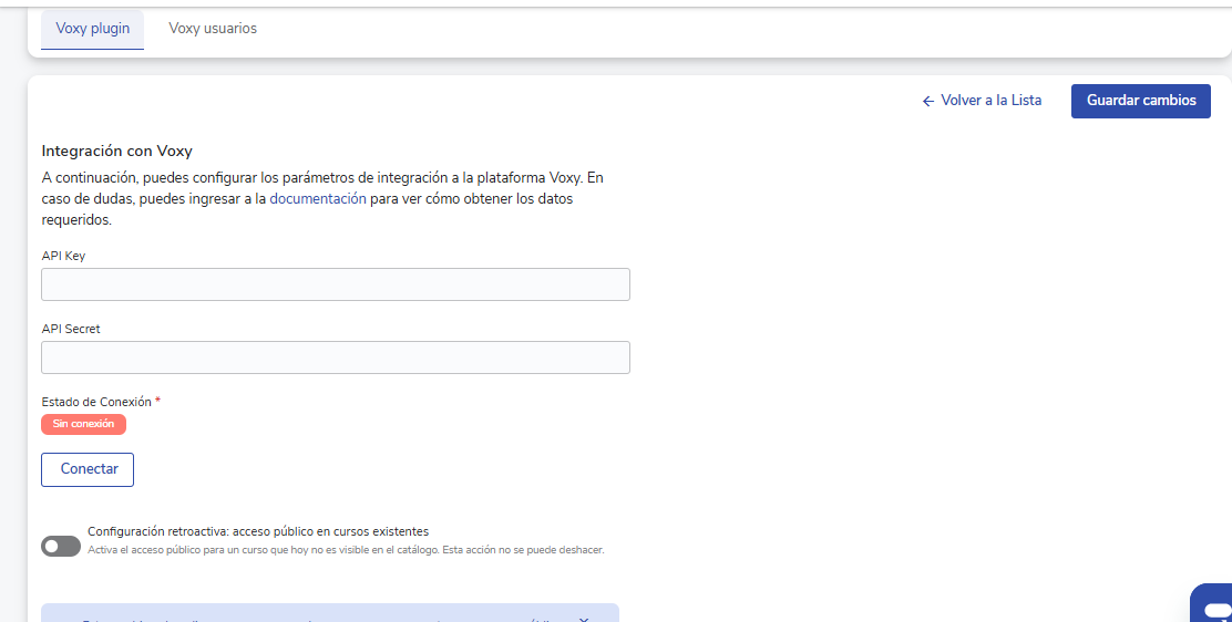 De tener la integración activa, desde esta sección puedes configurar que todos los cursos de este proveedor cuenten con acceso público, revisar a los usuarios vinculados con Voxy y sincronizar la información de colaboradores y sus avances.