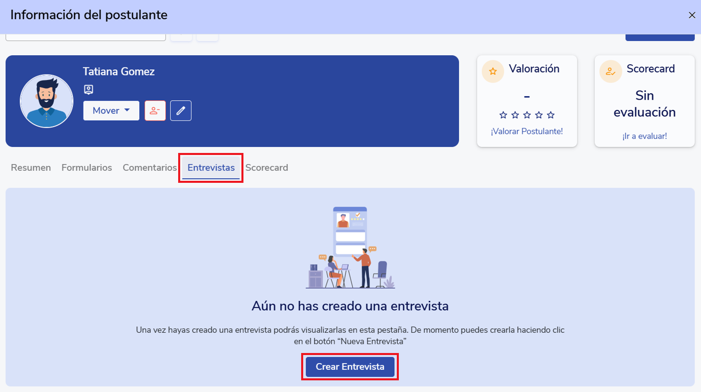 Se desplegará la ficha del postulante, debes ir a la pestaña "Entrevistas" y hacer clic en "Nueva entrevista"