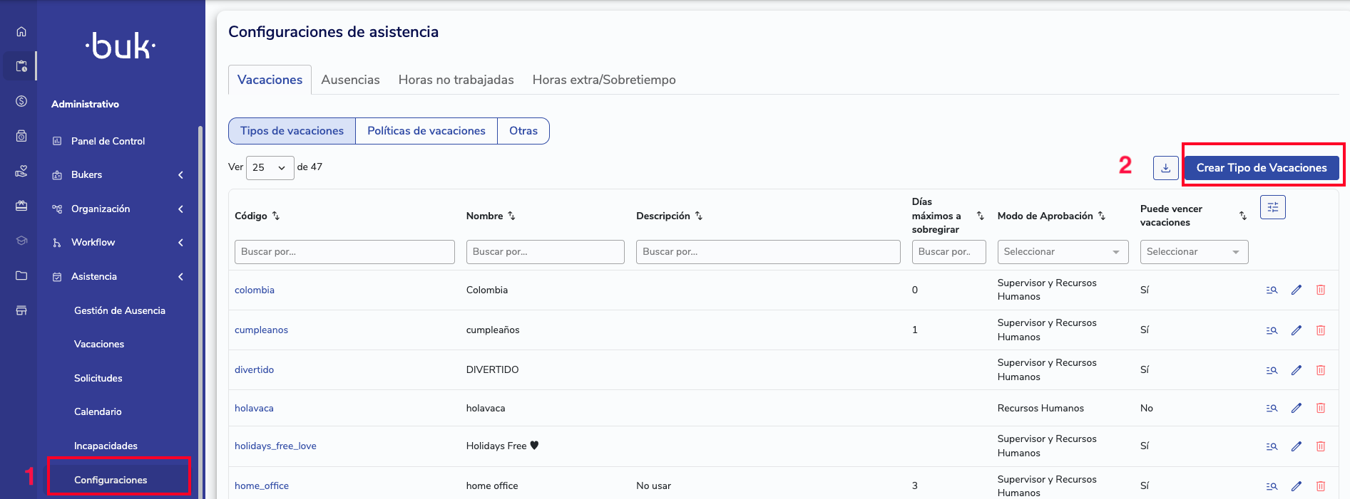 En Buk, la configuración de la prima vacacional se realiza en la sección de Tipos de vacaciones.