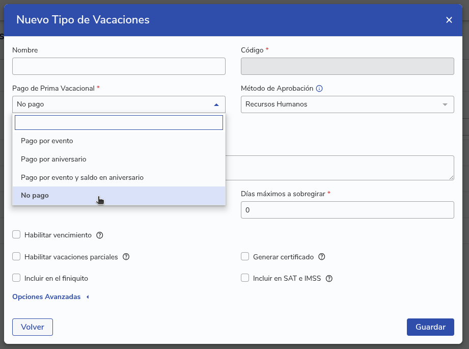 Ahí debes crear un tipo de vacaciones y, en el campo Pago de prima vacacional, seleccionar la opción No pago.