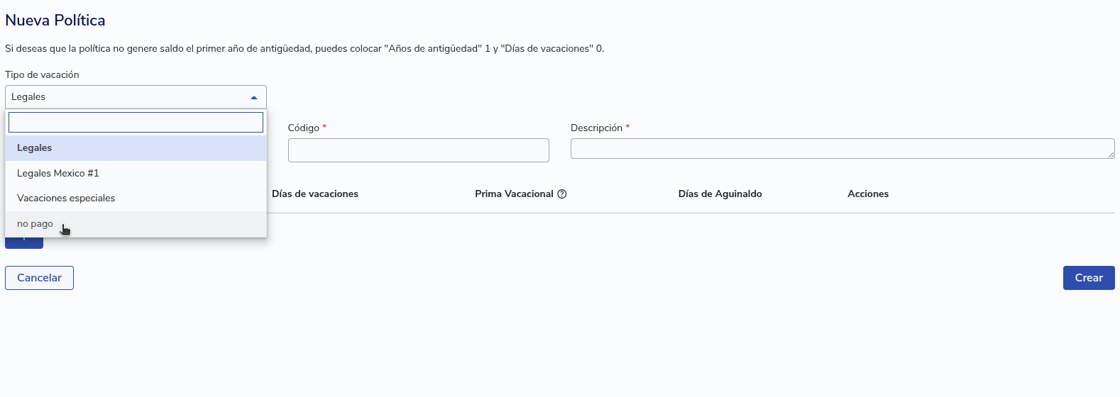 Para usar esta modalidad no basta con crear el tipo de vacaciones; también se debe crear una política de vacaciones nueva y asignarla a los colaboradores.