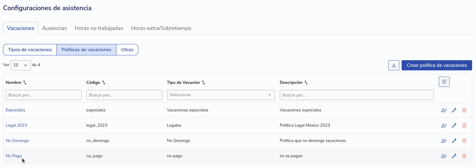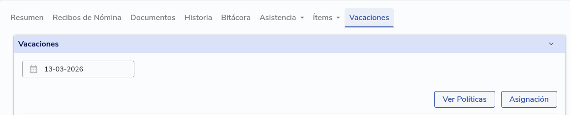 Después de crear la política, esta se debe asignar al colaborador como cualquier otra política de vacaciones.