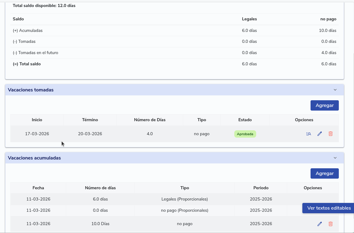Importante: no es posible editar una política de vacaciones ya creada para cambiarle el tipo de vacaciones, ya que este campo aparece bloqueado. Por lo tanto, si se requiere esta configuración, será necesario crear una nueva política.