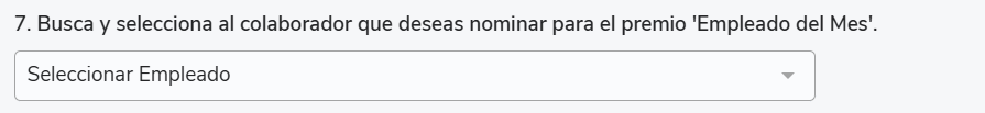 Los tipos de preguntas de Selección de empleados (7) y subáreas (8) permiten crear encuestas donde el encuestado pueda responder directamente un área y/o un colaborador.