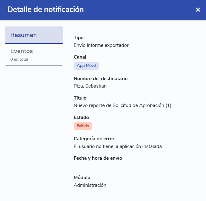 - Enviado: La notificación fue aceptada para ser enviada y está en camino al destinatario. Aún no hay confirmación de entrega. Para ello, selecciona "Ver detalle".
