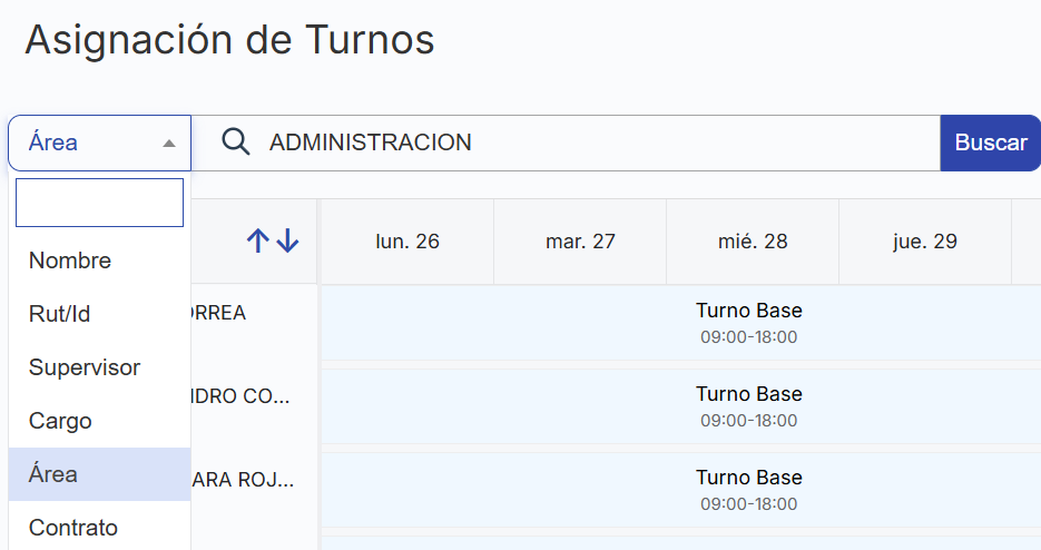 Buscamos al colaborador que le necesitamos modificar el turnos, podemos aprovechar las diversas formas de búsqueda en esta sección del calendario.