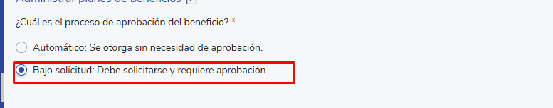 Para que se habilite la opción “Certificado de beneficios”, en el campo ¿Cuál es el proceso de aprobación de beneficios? debes seleccionar la opción “Bajo solicitud”.