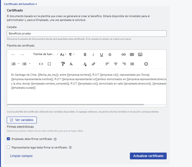 - En la sección “Certificado del beneficio”, podrás crear una plantilla del certificado utilizando las variables disponibles.
