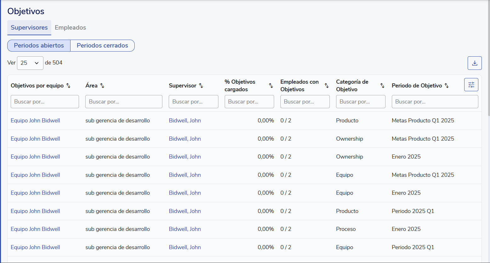 - Empleados: muestra todos los colaboradores que forman parte del equipo del supervisor, sin importar si tienen objetivos o no, para cada periodo.