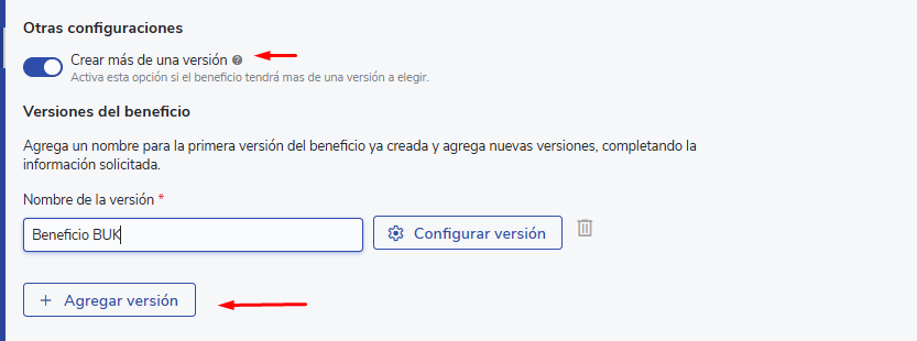 Para agregar versiones debes ir a la opción “Otras configuraciones” y activar la función “Crear más de una versión” (recuerda que cada beneficio automáticamente se crea con la versión original, es decir el nombre original del beneficio y podrás agregar más versiones según sea tu necesidad).