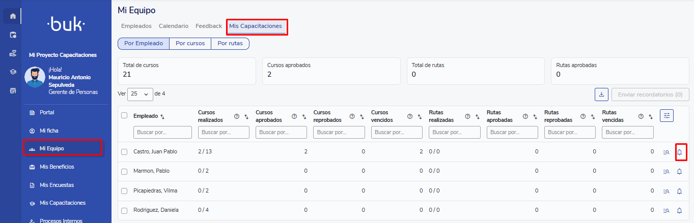 Este artículo tiene como propósito guiar a las jefaturas en el uso de la sección “Mi Equipo” (Capacitaciones), desde donde podrán hacer seguimiento al avance de capacitaciones de sus equipos, visualizar rutas de aprendizaje y cursos en los que están inscritos sus colaboradores, y enviar recordatorios para fomentar la finalización de estos. Esta funcionalidad está disponible exclusivamente para jefaturas con permisos asignados en Buk, y permite ver únicamente a los colaboradores asociados a su unidad organizacional; no contempla acciones de inscripción ni edición de cursos desde esta vista.