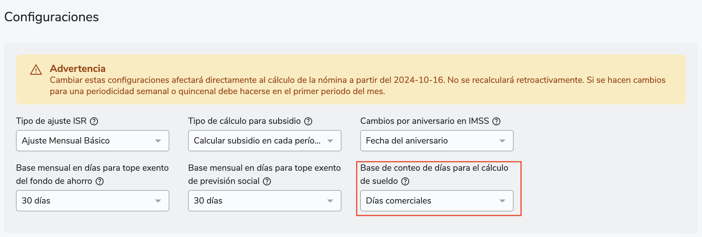 Esta configuración permite que los clientes definan si desean trabajar con Días Comerciales (30 días) o Días Naturales (días reales del calendario) para reflejar de manera más precisa los días pagados en cada periodo de nómina.