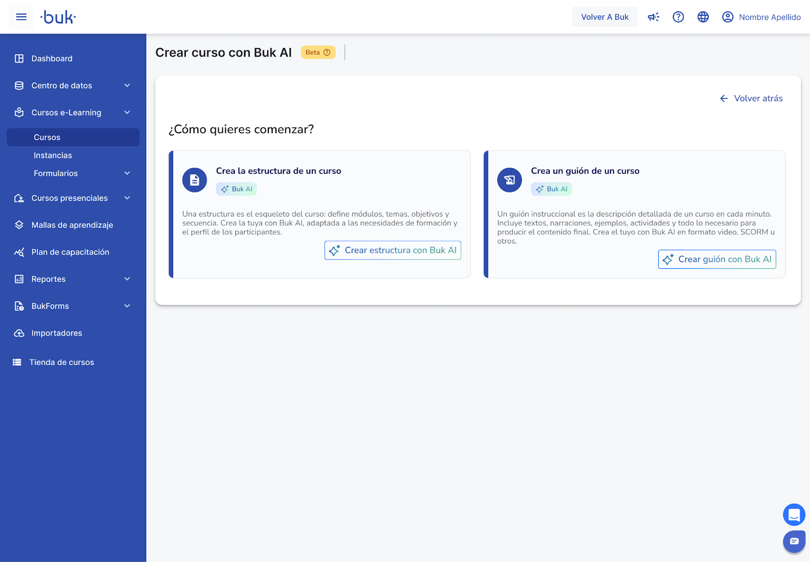 Buk AI te ayuda a convertir tus ideas y materiales en un guión instruccional completo, claro y listo para avanzar a producción.