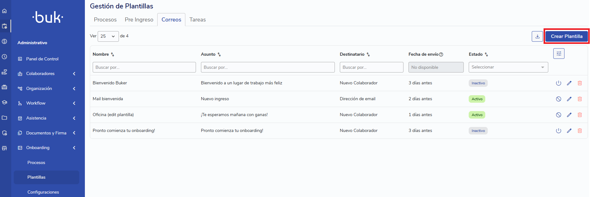 - Ingresa a Administrativo > Onboarding > Plantillas > Correos
