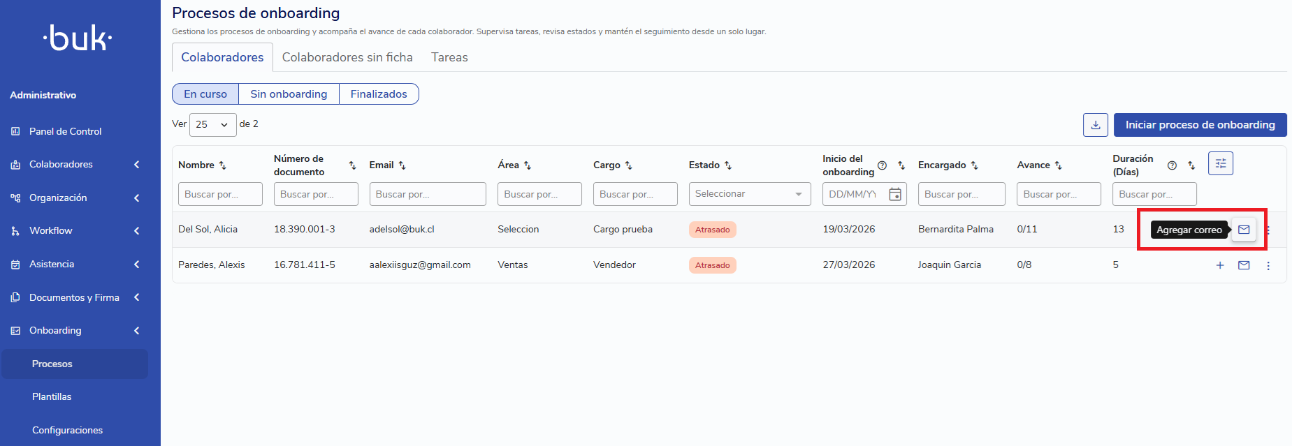 Los correos permiten automatizar comunicaciones dentro del proceso de onboarding. Con ellos puedes, por ejemplo: