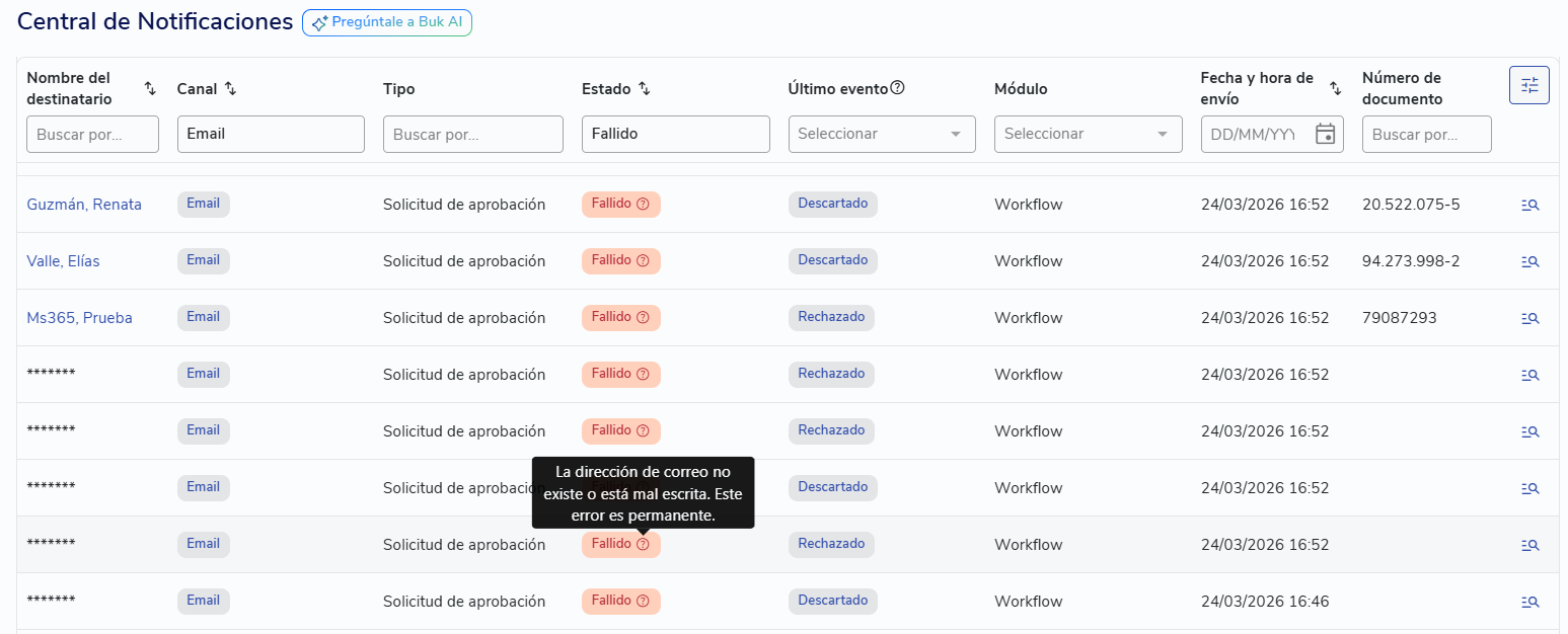 Si un correo aparece como fallido, al pasar el cursor sobre el estado podrás ver el motivo del error.