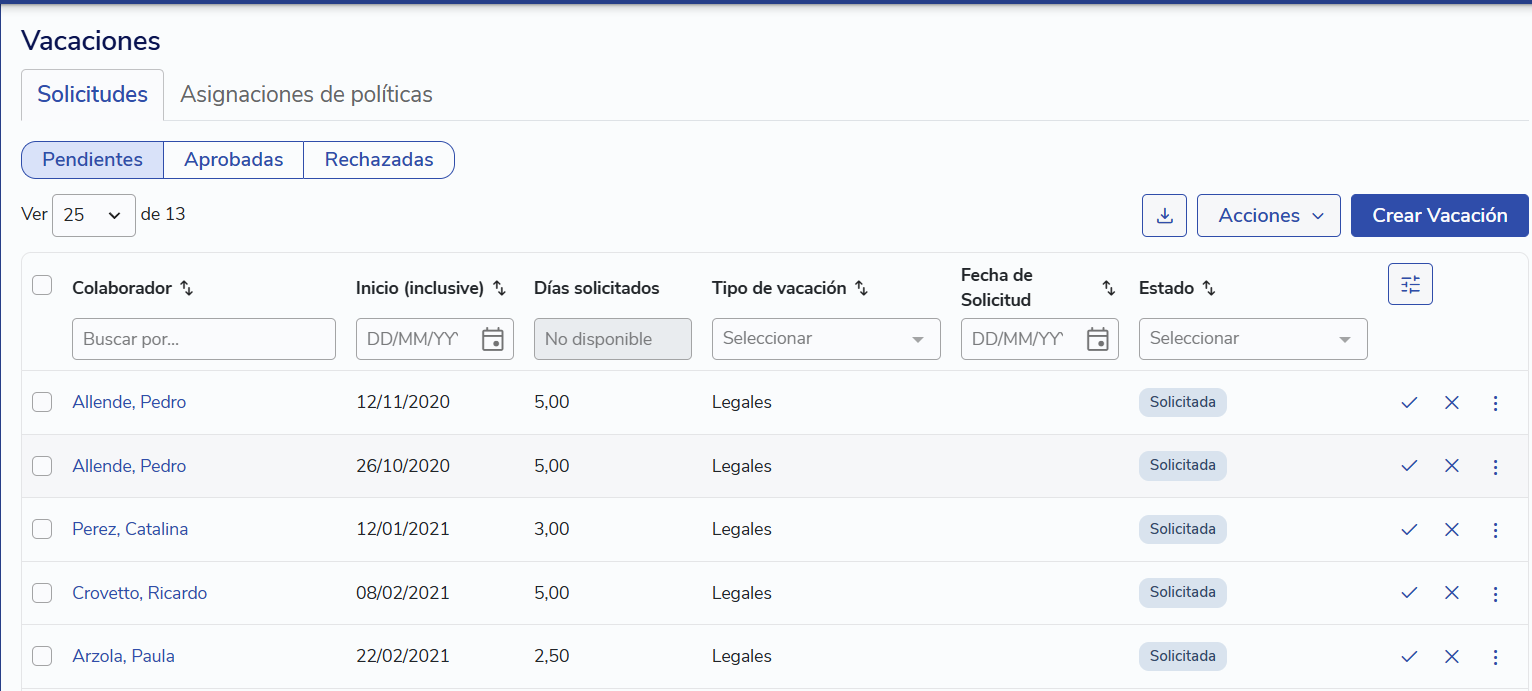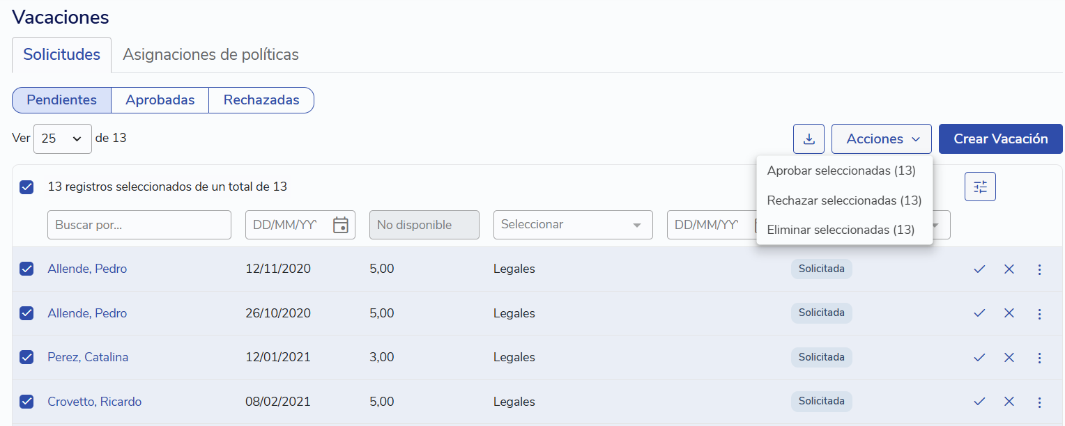Con el botón "Acciones" podrás ejecutar los procesos masivos de aprobar, rechazar o eliminar vacaciones.