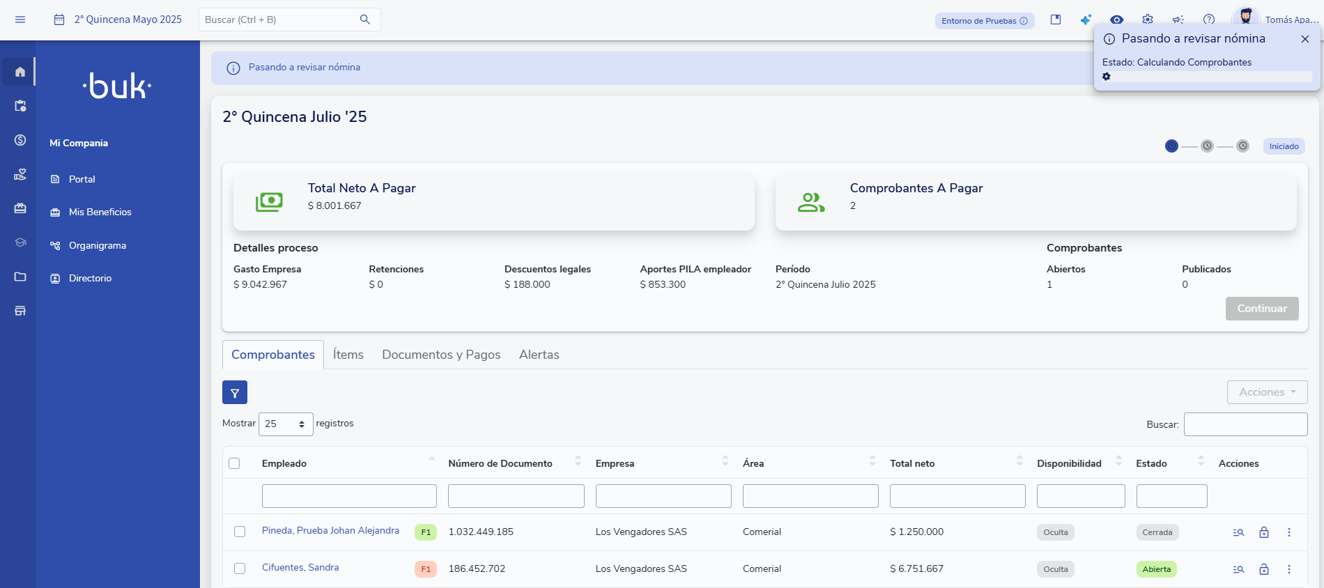 En revisión: Segundo estado del proceso, para la revisión antes del cierre de nómina.
