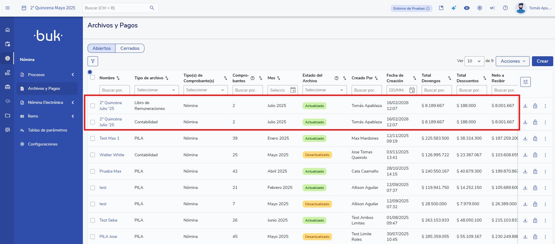 - Ingresa a Nómina> Archivos y pagos y podrás descargar los archivos generados.