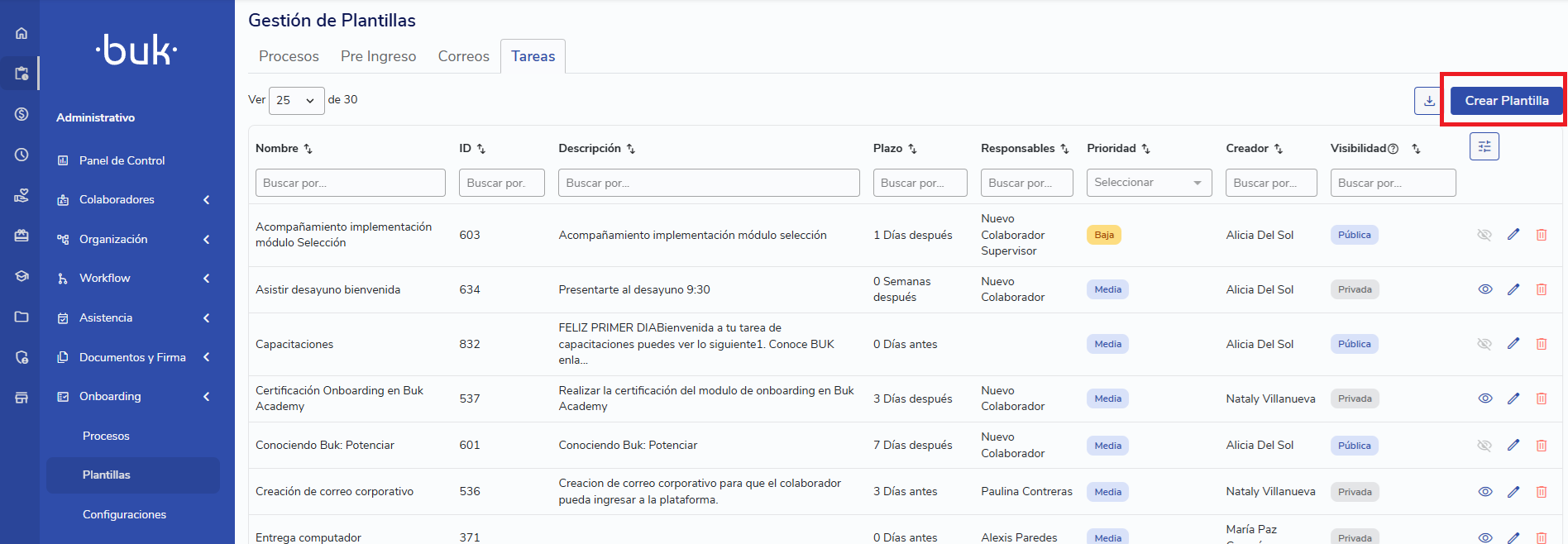 - Ingresa a Administrativo > Onboarding > Plantillas > Tareas