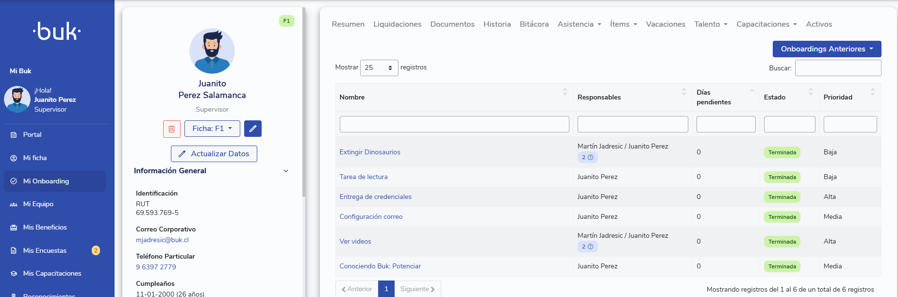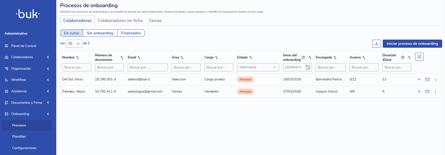 Puede revisar el conjunto de tareas del onboarding y hacer seguimiento a su estado de los procesos de los que es responsable en la seccion Oboarding>Procesos: