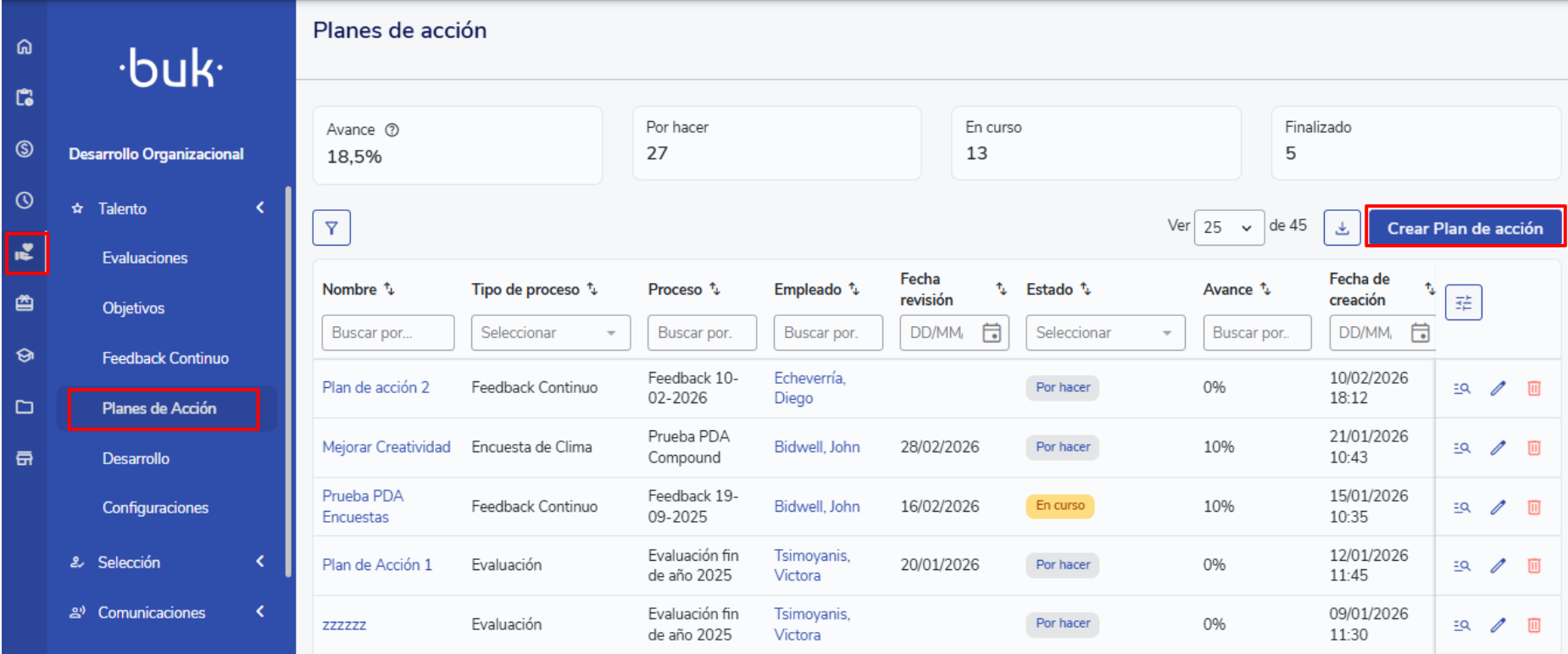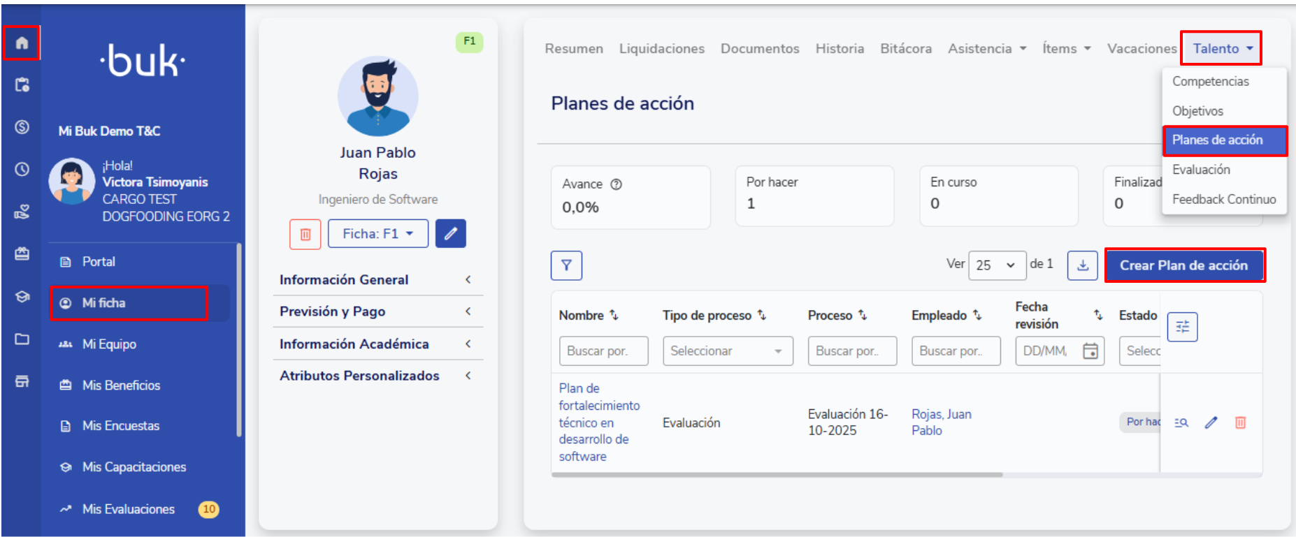 - En el menú lateral izquierdo ve a Talento > Planes de Acción