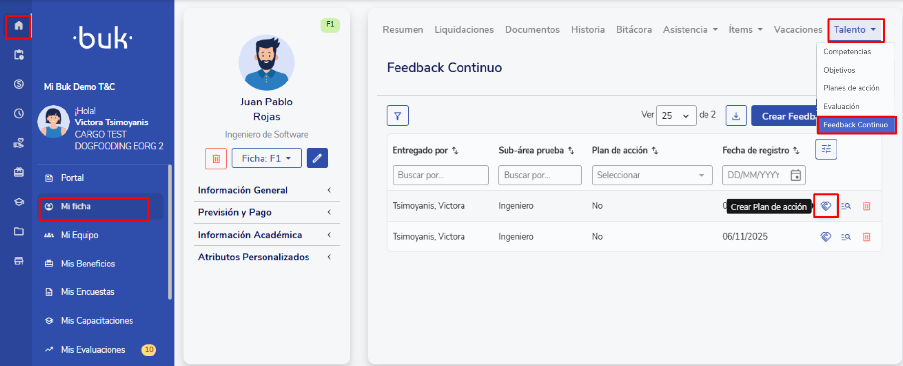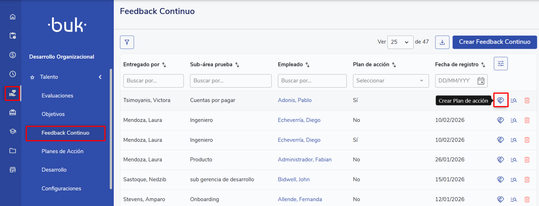 - En el menú lateral izquierdo ve a Talento > Feedback continuo y ubica el feedback al que le quieras asociar el plan.