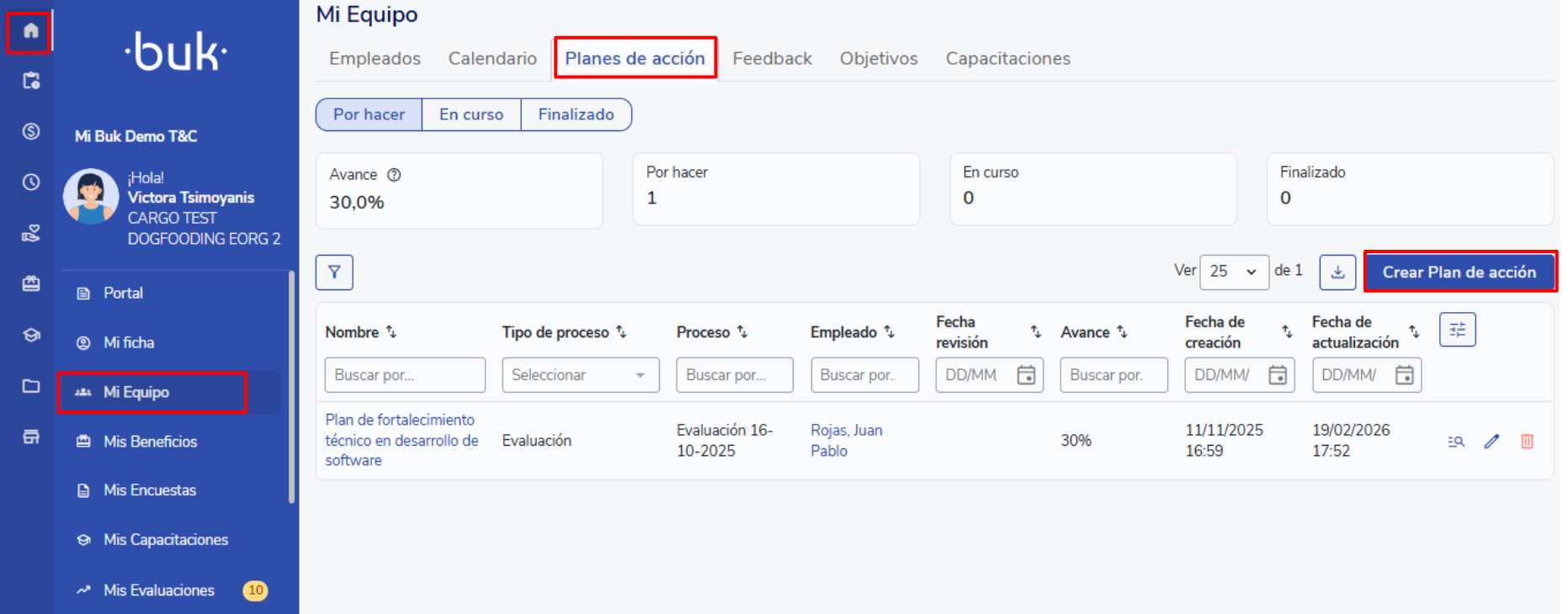 Desde Mi Equipo > Planes de acción (Sólo para supervisores/líderes)