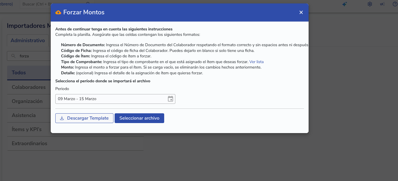 Selecciona el importador Forzar Montos (o Forzado de ítems).