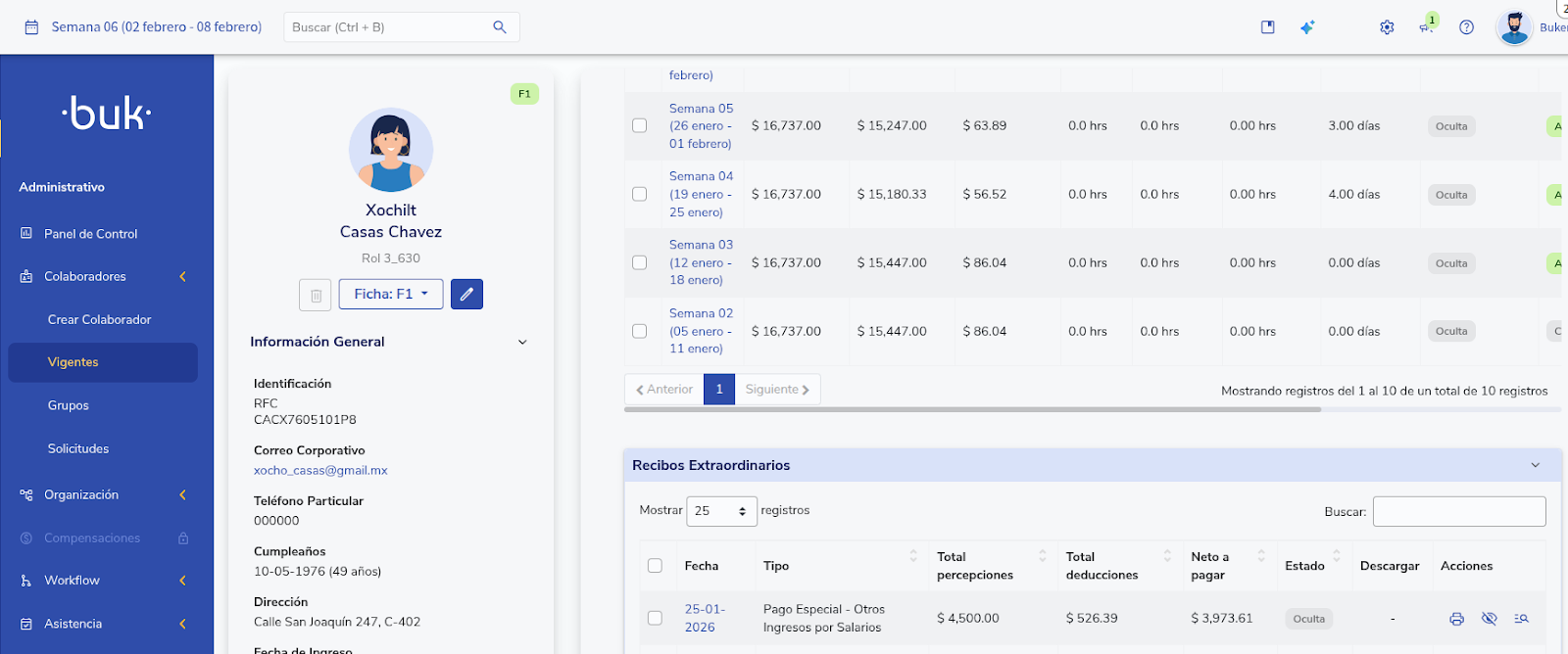 Si vamos a la ficha del colaborador encontraremos un apartado llamado Recibos extraordinarios donde se puede visualizar el comprobante extraordinario asociado al colaborador.