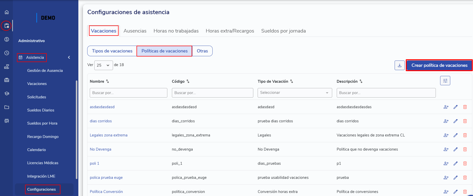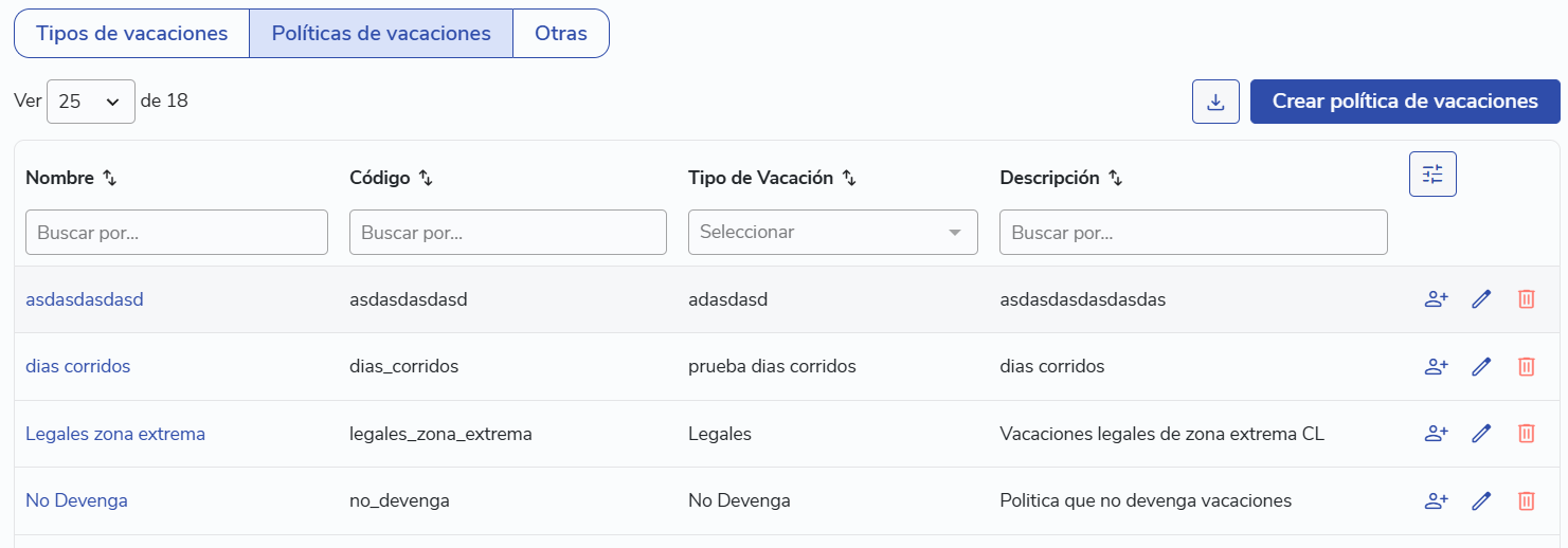 Esta pantalla te permite ver todas las políticas de vacaciones existente junto con las opciones de crear nuevas, editar o eliminar alguna política de vacaciones.