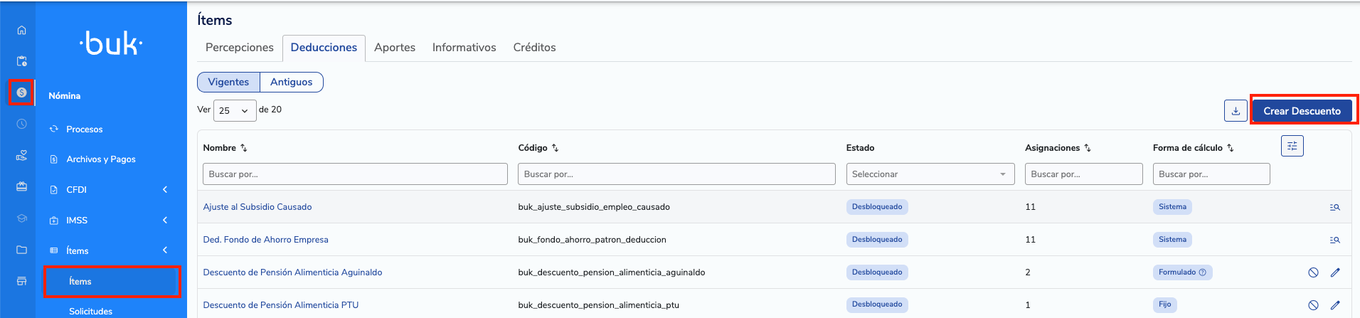Para comenzar, dirígete a: Nómina > Ítems > Deducciones > Crear descuento