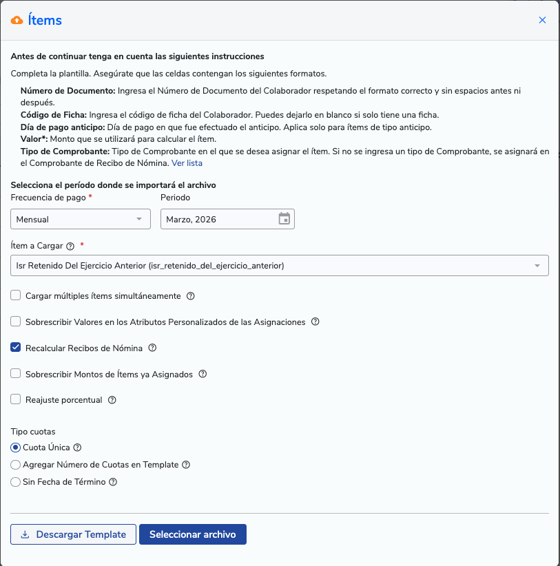 3. Selecciona el ítem a cargar: Elige el ítem que creaste previamente:ISR retenido del ejercicio anterior