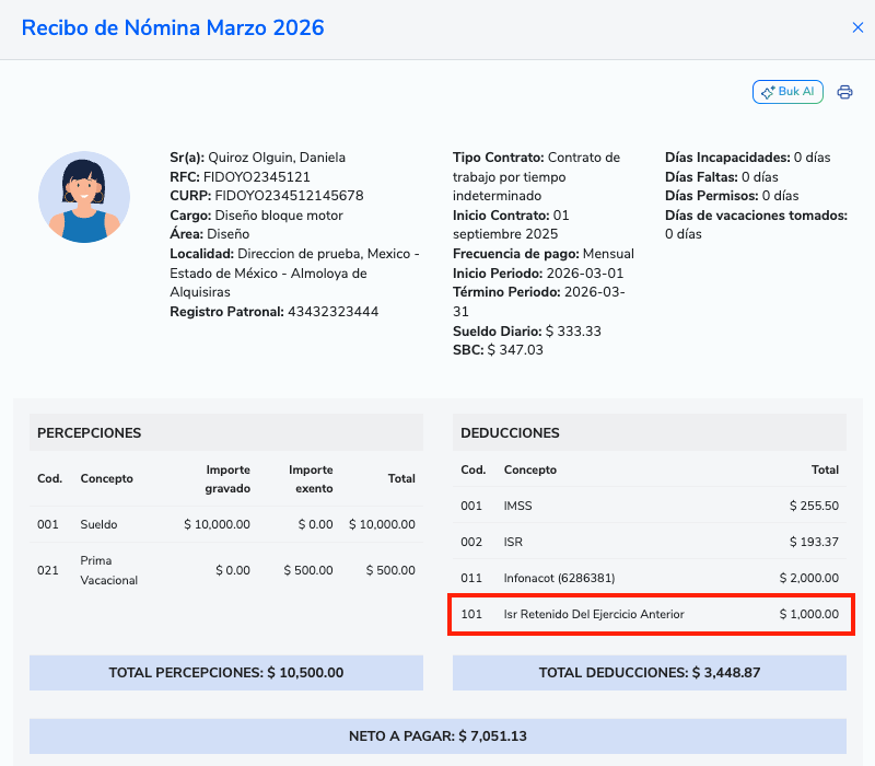 Código SAT / CFDI: 101 - ISR retenido del ejercicio anterior