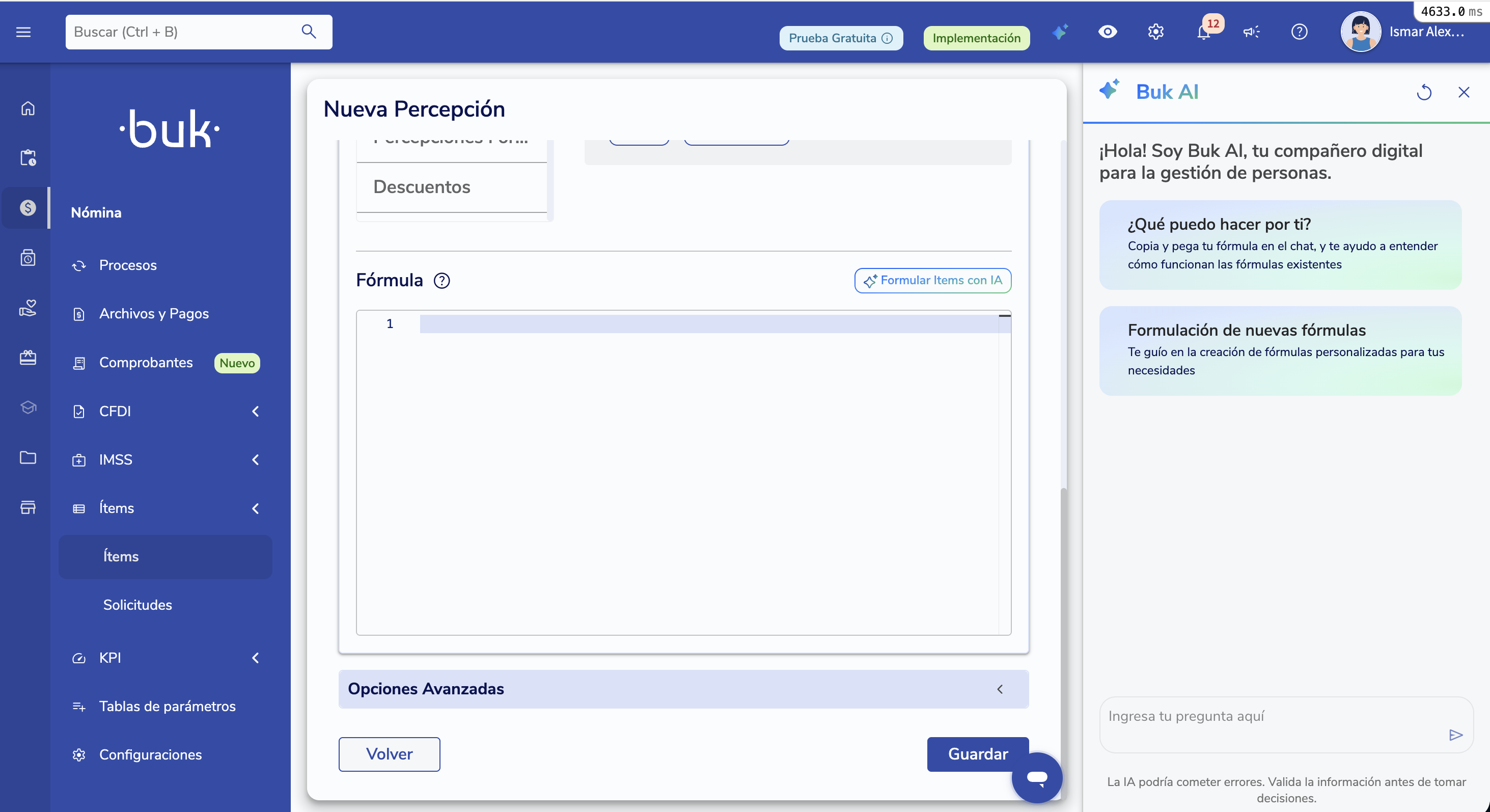 En Buk puedes crear fórmulas para ítems de remuneraciones usando el Asistente de IA, que traduce instrucciones en lenguaje natural a la sintaxis de fórmulas que Buk utiliza. Esto facilita y agiliza la creación de reglas de cálculo para haberes, descuentos o ítems informativos.