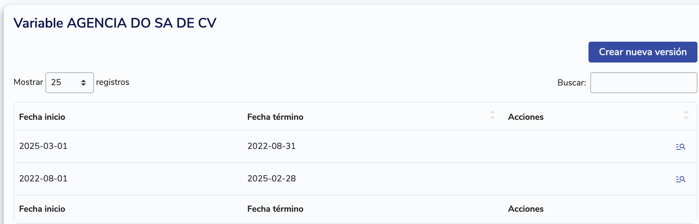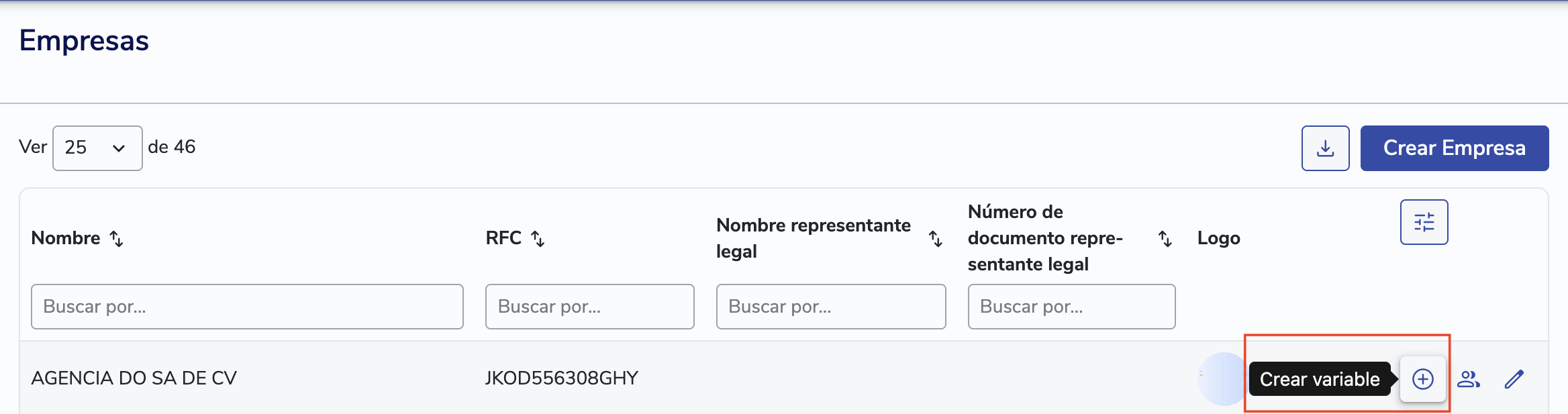 - Verás una tabla con las empresas creadas. En las acciones de la empresa correspondiente, selecciona Crear variable para administrar los registros patronales y sus configuraciones.